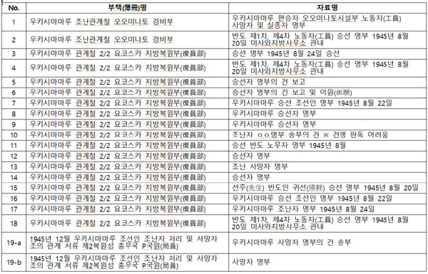 외교부는 5일 보도자료를 통해 “외교부는 그간 우키시마호 승선자 명부를 입수하기 위해 일본 정부와 교섭을 거친 결과 9월 5일 일측으로부터 승선자 명부 일부를 제공 받았다”며 “일측은 내부조사를 마친 자료 19건을 우리측에 우선 제공하였으며, 여타 자료에 대해서도 내부조사가 완료되는 대로 제공하기로 했다”고 발표했다.