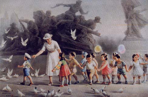 북한에서도 평화는 멀고 험난한 길이다. 그리고 슬프다. 해군복장에 장난감 총을 멘 아이를 등장시키는 화가의 마음도 편치 않았을 것이다. 풍선을 들고 유원지를 향해야 할 아이들이 총을 앞세우고 전쟁기념장소를 걷다니...