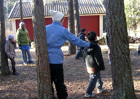 나무에 붙어 있던 사바가 잽싸게 다른 남자애와 자리를 바꾸자 술래인 소년이 얼른 몸을 틀어 사바를 잡았다.
