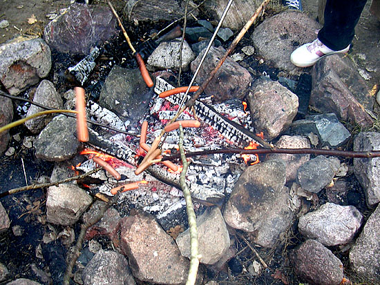 기다란 나무 작대기의 겉껍질을 벗기고, 끝 부분을 뾰족하게 깎은 후 각자 가지고 온 소시지를 꽂아 모닥불에 구웠다.
