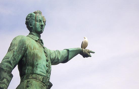 전쟁광이었지만 전쟁에는 재주가 없는 불행한 왕이었던 칼 12세의 동상 앞에서 우리들은 멈춰 섰다. 칼 12세의 동상은 말하자면 Kungsträdgården의 명물인데, 동상의 손가락이 가리키는 곳은 러시아 방향이다. 어쩌면 당연한 결과일지도 모르겠지만, 칼 12세는 러시아를 정복하지 못했고, 노르웨이에서 전쟁 중 사망했다. 국민들에게는 미움 받은 왕(전쟁을 좋아해서 허구한 날 전쟁을 치르고 다녔지만, 나가는 족족 지고 오고 배상금 물어주고 하니 국민들이 좋아할 리 만무했다)이었지만, 새들에게는 사랑을 듬뿍 받고 있는 것이 재미있었다.