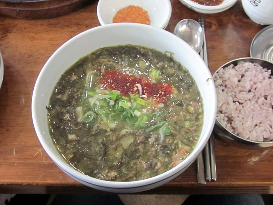 이번에 소개할 음식은 ‘몸국’입니다. 제주에 도착하자마자 마침 오일장날이어서 시장에 갔는데요, 식당마다 있던 메뉴입니다. 나름 음식에 관심이 많은 저도 몸이 무엇인지 몰라 과연 입에 맞을까 하면서 조심스럽게 시켰는데요, 된장 국물로 만든 육개장에 각종 나물 대신 해조류가 잔뜩 들어간 맛이라고 하면 좀 전달이 될까요?